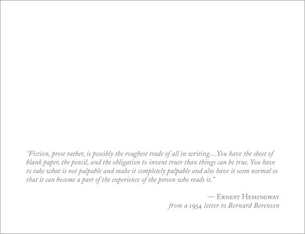“Fiction, prose rather, is possibly the roughest trade of all in writing….You have the sheet of blank paper, the pencil, and the obligation to invent truer than things can be true. You have to take what is not palpable and make it completely palpable and also have it seem normal so that it can become a part of the experience of the person who reads it.”