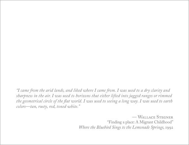 “I came from the arid lands, and liked where I came from. I was used to a dry clarity and sharpness in the air. I was used to horizons that either lifted into jagged ranges or rimmed the geometrical circle of the flat world. I was used to seeing a long way. I was used to earth colors—tan, rusty, red, toned white.”